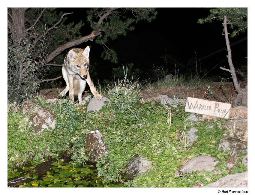 Coyote carefully approaching pond due to flash camera trap, Los Alamos, NM