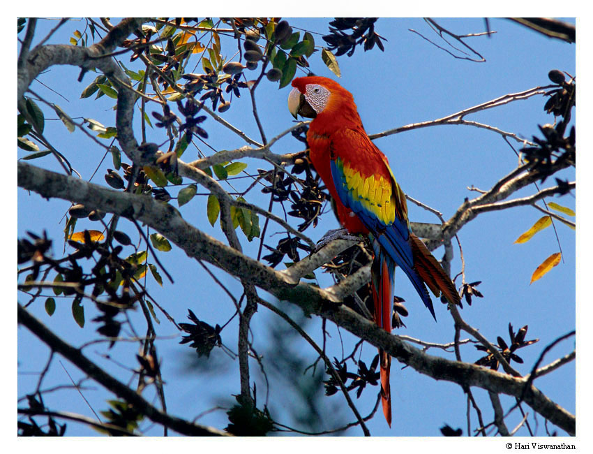 The Scarlet Macaw is endangered since so many have been captured for the pet trade. In addition, much of the primary forest that they inhabit has been destroyed. We saw a Scarlet Macaw perching on a tree near Carrara National Park but he was mostly obstructed. Years later we saw this fellow eating from a fruiting tree at Amazonia lodge in Peru (more pictures can be seen in the Peru section). It is more common to see Scarlet Macaws in flight and we saw this pair at Carrara: (Click)