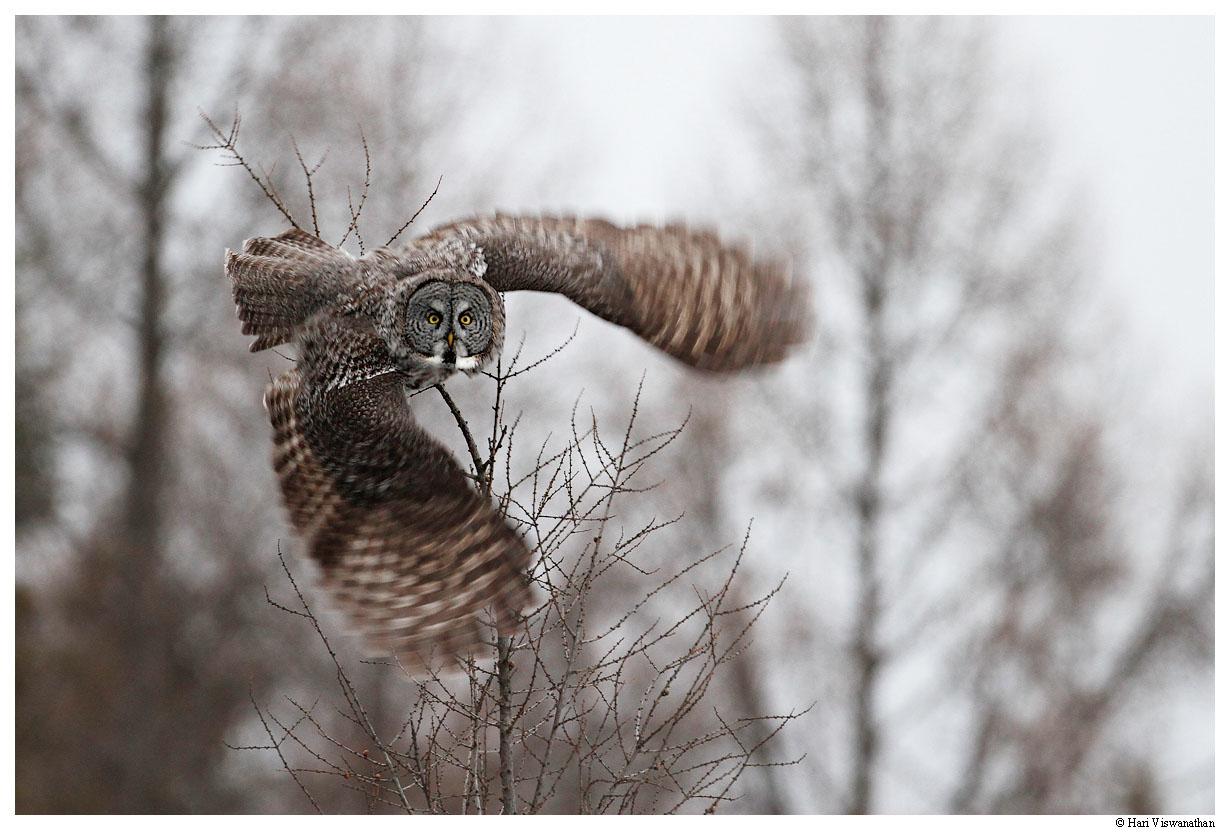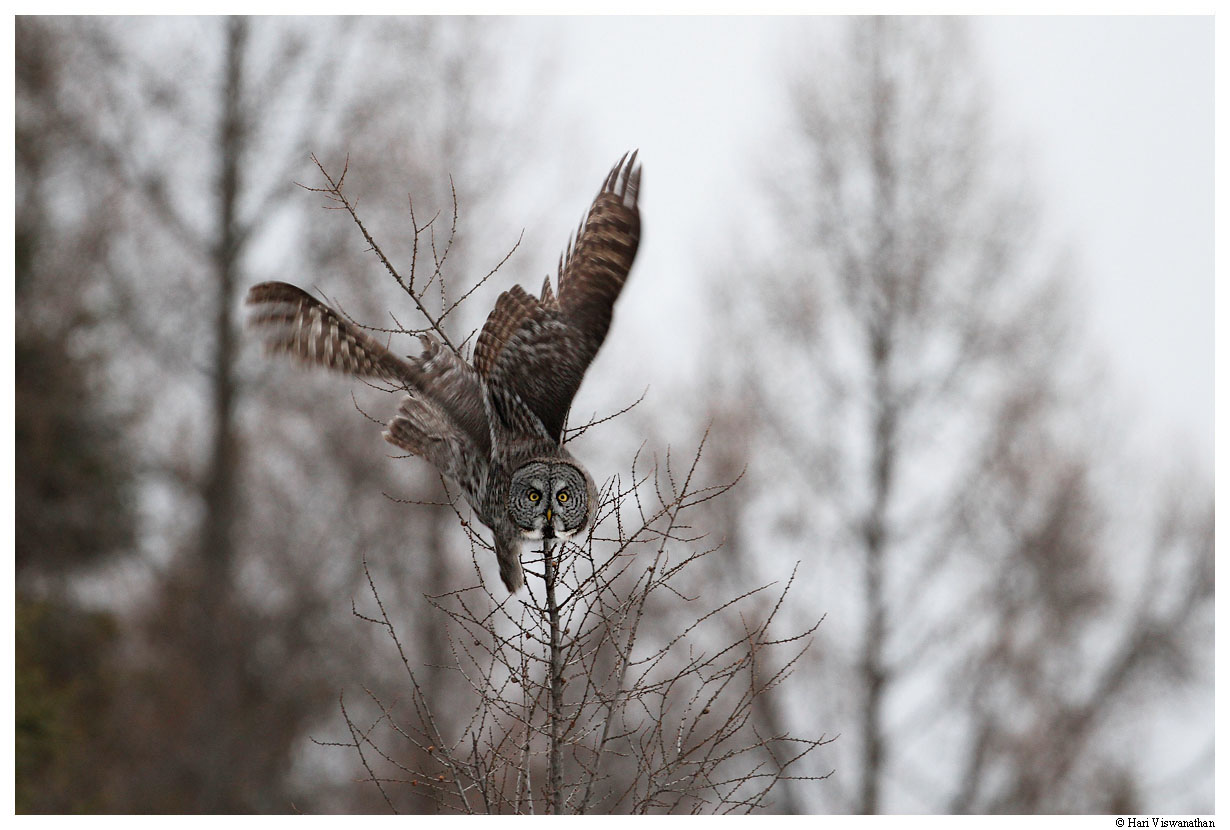 A typical hunting sequence consists of the Great Gray locking on to his target.